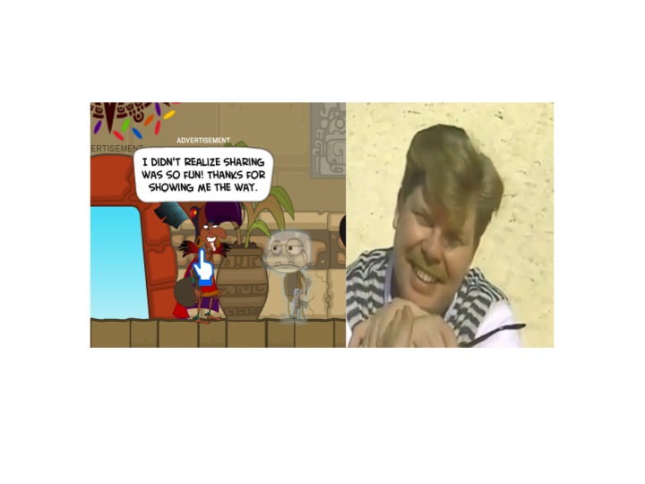 Well since I have only minutes till I have dinner… there is another fruit loops ad in Poptropica. These creators are nuttiest of the nutty. Nutty crunchies-they’ll make you nutty! I kid, I kid. So here’s the basic plot: This Aztec king doesn’t share his loops. Loops? So then you have to beat him at these challenges. Then he’ll “share.”