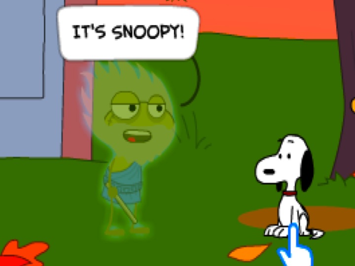 The annoying orange! Actually, it’s not him. It’s Snoopy! He’s come to Great Pumpkin Island!  And apparently he has nothing to say. But everyone else has more to say, so be sure to chat with them!