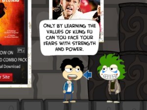 Actually, the game won’t begin until ————-. But here’s the new ad I wanted to point out. Karate Kid! It can be found on Skullduggery or Spy. You apparently grab all the jars with the right symbols on them. And avoid the bullies. You’ll be awarded a karate kid outfit and kick move.