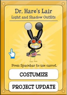 Of course, we’ve got one more item to give away to thank everyone for their support. The Dr. Hare Light and Shadow Outfits are available now, absolutely free! All you need to do is log into your Poptropica account and enter the promo code DRHARE10000.