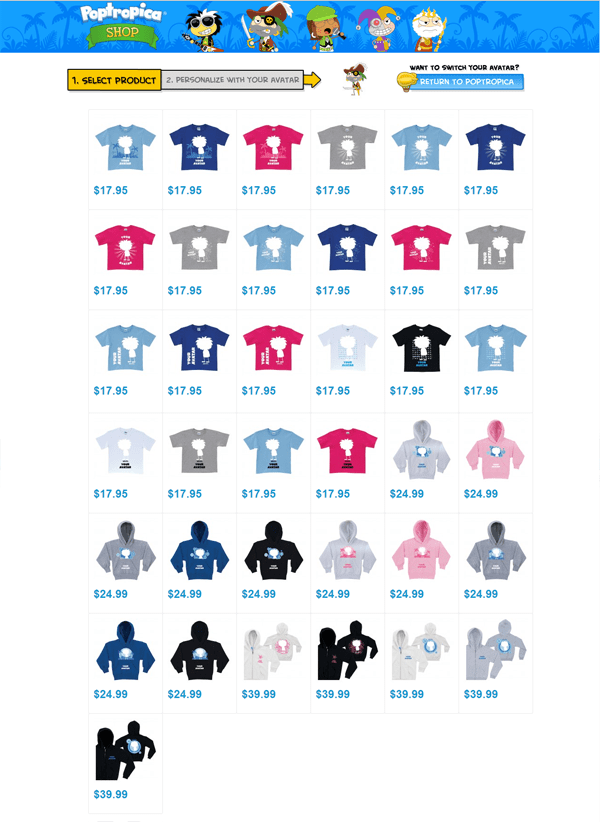 That wasn’t all: the Poptropica Shop (not to be confused with the game’s store) was also released, offering the ability to put your Poptropican on a shirt or hoodie. Adult sizes were available for the kids at heart, too.