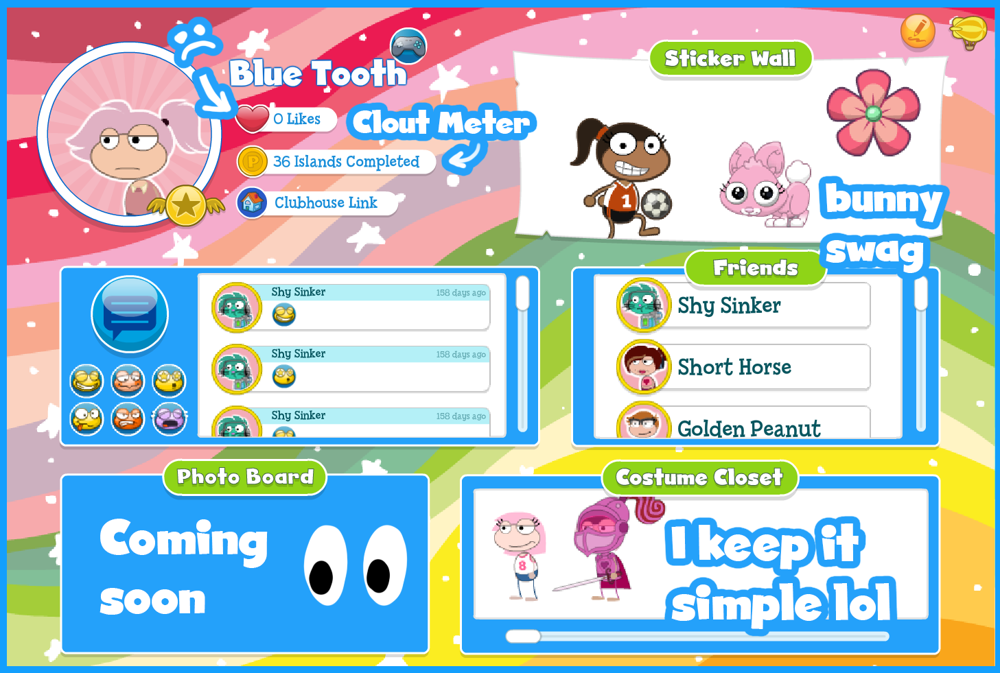 • The ability to add friends by username and see all your friends’ profiles listed. Blue Tooth herself mentions that “no one’s liked my page, yet” (sorry to bring it up, BT)—but if she were to share her username, and if we could add friends by username, you could bet the face of Poptropica’s social media would be lined up with likes. Plus, you can only see about 10 of your friends listed at a time, so even if you had her added, you might not ever find her profile!