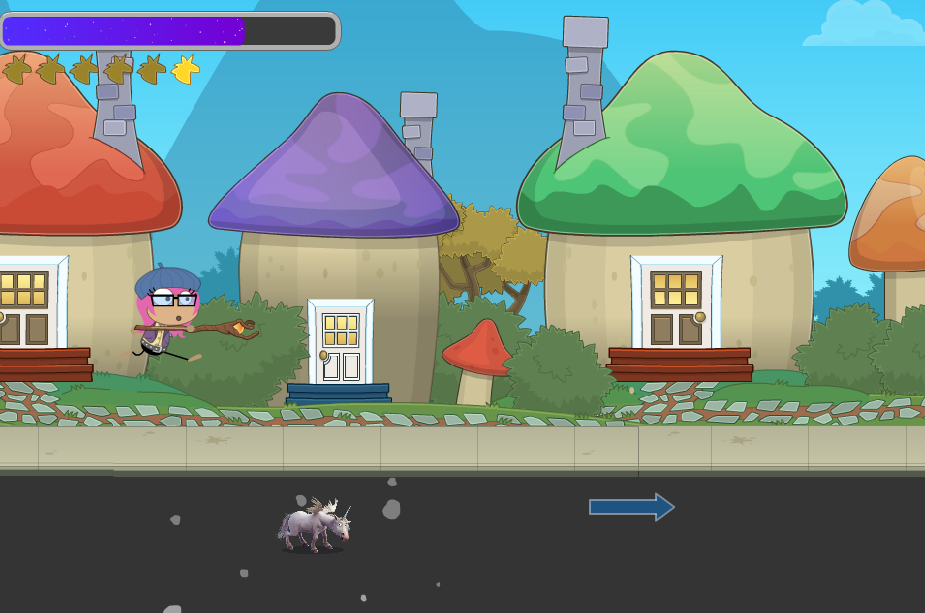If you decide to go inside, talk to Barley. He will let you know that the neighborhood has been invaded by pesky trash-eating unicorns and give you a magic staff to use. Press the spacebar to fire magic rays and shrink the unicorns, and click the mouse to jump over trash cans in your path.