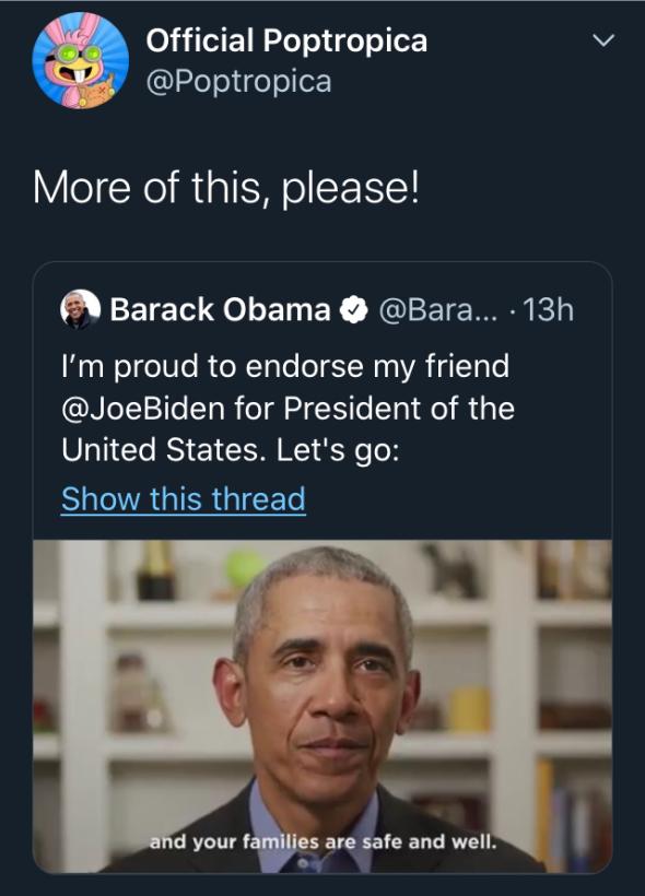 …what we got was an endorsement for Joe Biden for President of the United States, retweeted from Barack Obama with Poptropica adding, “More of this, please!” The inadvertent tweet received about 30 likes, 7 retweets, and 20 replies of amusement before it was unceremoniously deleted two days after it first surfaced on April 14.