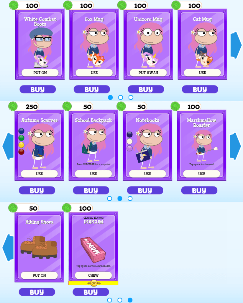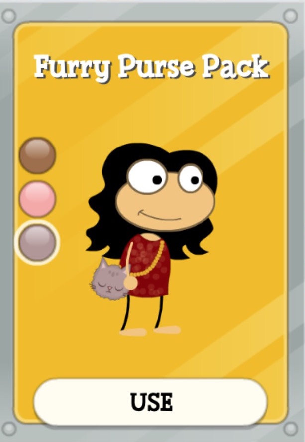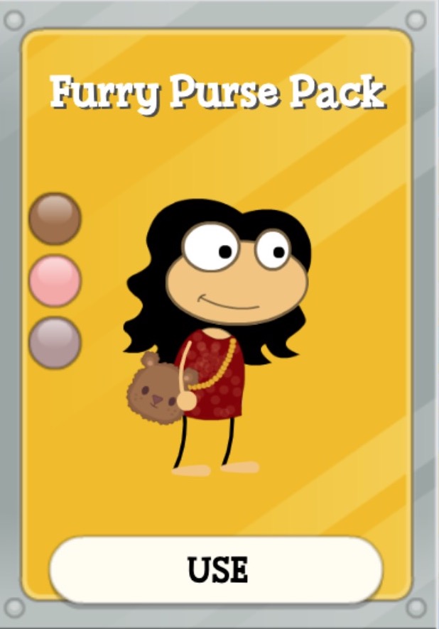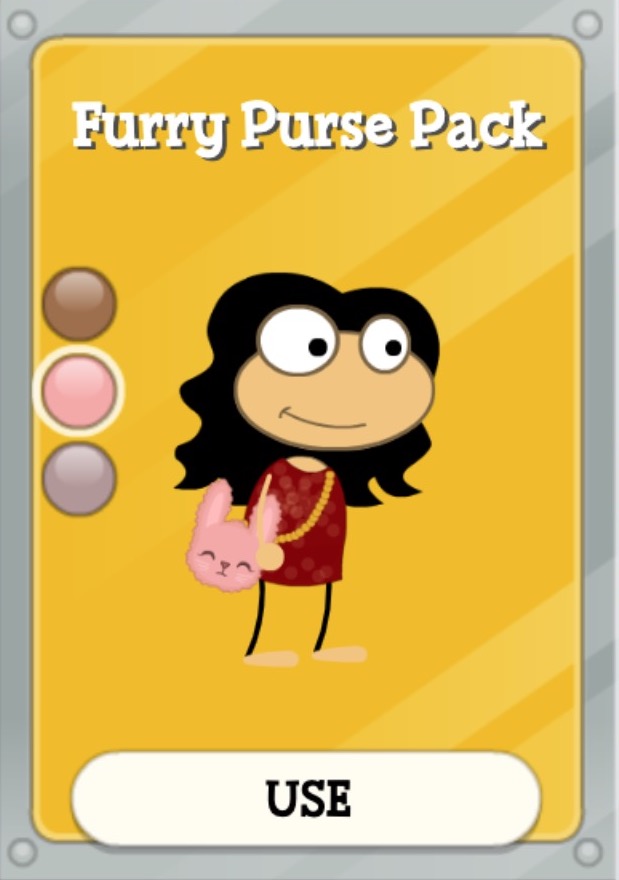 Hey Poptropicans, new member gifts are here, and they come in packs of three! First up is the Furry Purse Pack, with variants of a cute brown bear, happy pink bunny (not at all like the evil Dr. Hare), and a sleepy gray kitty. It’s an overshirt item, so it can’t go with jackets.