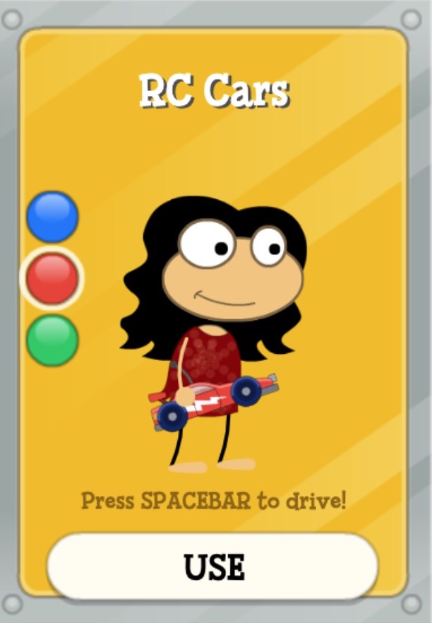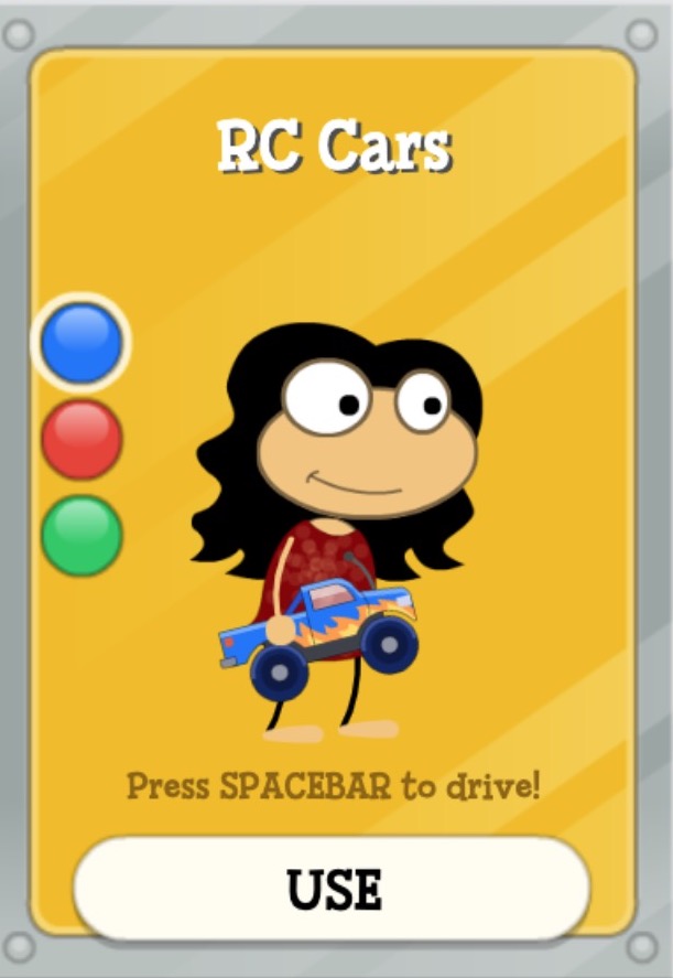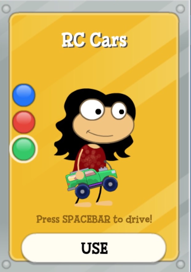 The last batch of bonus goods are the RC Cars, or remote controlled cars, although you can’t see the remote. They come in blue (with flames), red (with lightning), or green (truck style), and pressing space bar will make the car drive around a couple times on the ground.