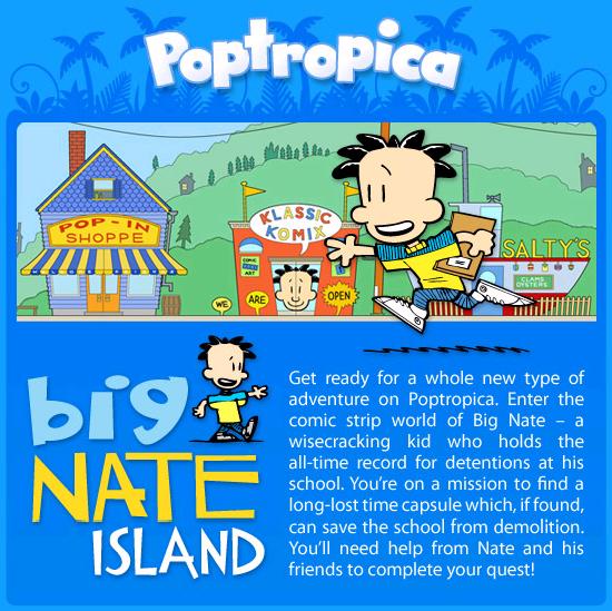 Now let’s turn to Big Nate, which began as a comic strip and now has a pretty popular narrative-and-art hybrid book series. But before the book series, there was the Poptropica island.