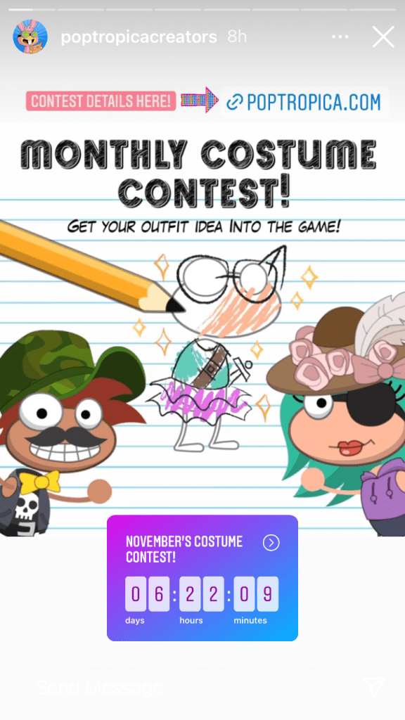 Beyond dressing up on Poptropica, you can also give your character some flair through drawings! Poptropica’s latest Instagram stories feature some expressive Popsona designs, as well as a call to join the monthly costume contest, which runs until this Friday, November 19.