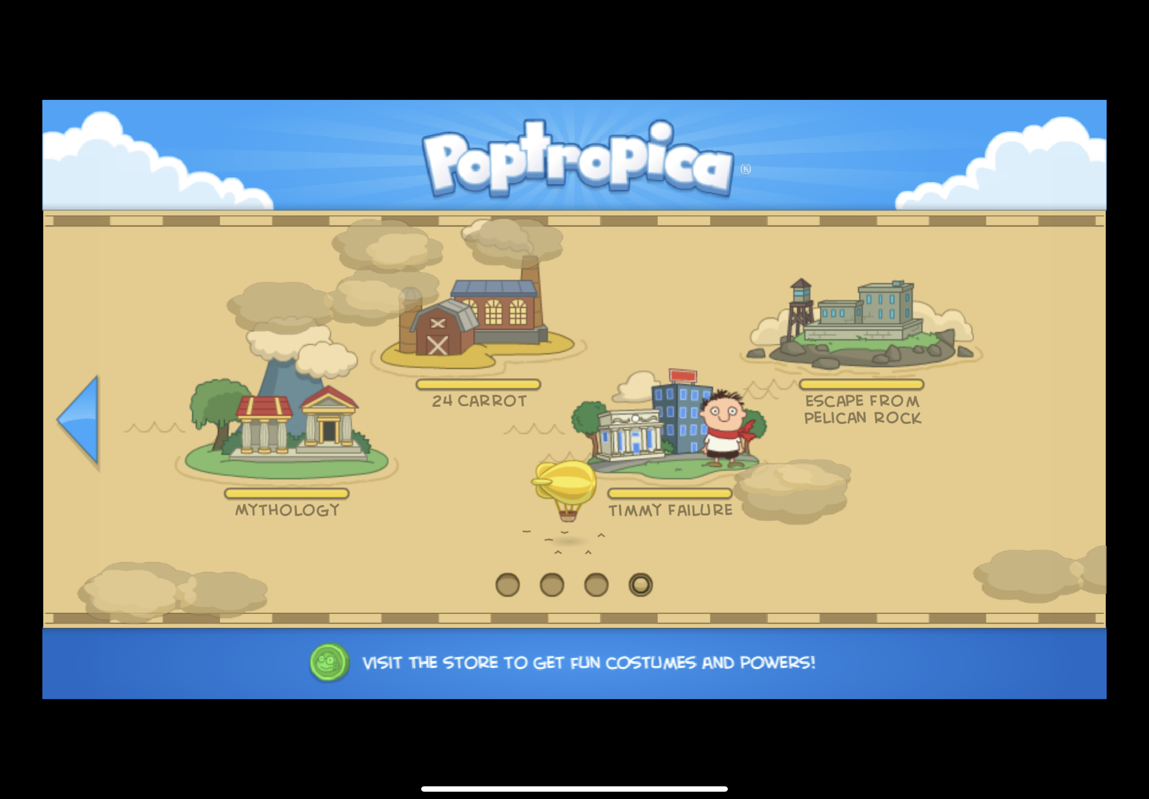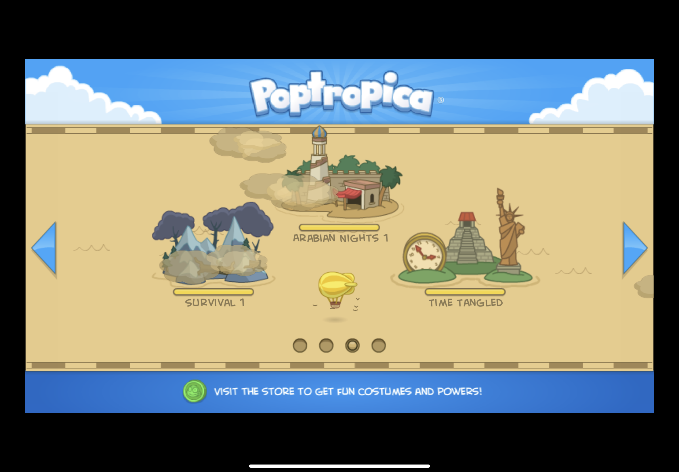 You will begin on home island, and you will see the clubhouse if you climb on the platform, but the door will have a sign saying coming soon. In Home island of Poptropica on now.gg aptoide there will be the new you salon, pet barn, the pop store, the movie theater but it won’t let you in, there is also the rocket arcade in the back and that’s all in home island. When you click the blimp it will take you to the map.