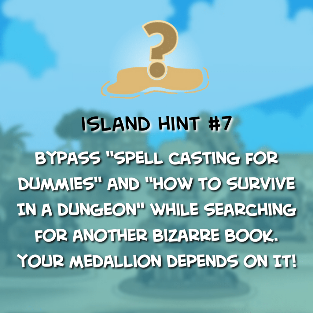 The seventh hint ups the challenge with a more obscure reference: “Bypass ‘Spell Casting For Dummies’ and ‘How to Survive In A Dungeon’ while searching for another bizarre book. Your medallion depends on it!”
