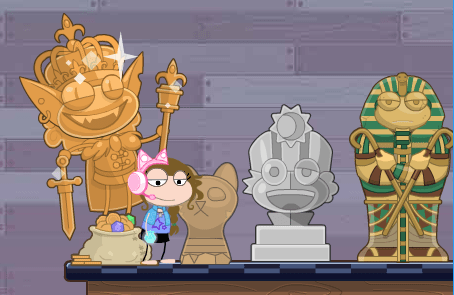 Finally, we have a golden statue from the Fairytale Island treasury, which used to be a statue of the king, but now, well… I imagine you can guess. We have a sandstone bust of a cat and a sarcophagus to hold a mummy, both also donated by the Museum of Really Old Things. Finally, there is a bust of Goofball Island’s founder, Emperor Thirsty Flame III.