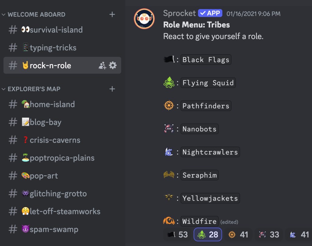 The games will take place here on the PHB and our moderated Discord server, the PHC (Poptropica Help Chat). On the PHC, we’ll have special chat channels for each tribe. To join yours, visit the #rock-n-role channel on the PHC and select the emoji of your tribe of choice to join the tribe. (If you’re having trouble, message or tag a PHC staff member.)
