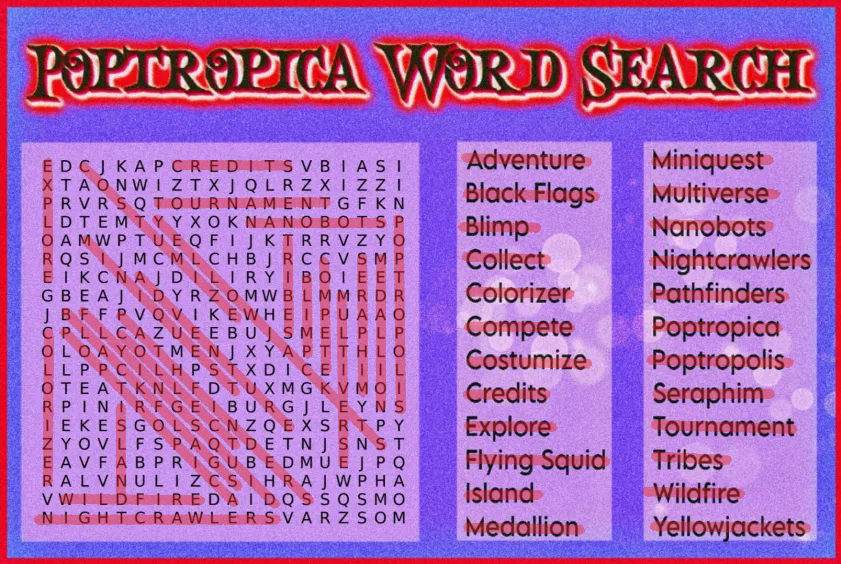 In this competitive game, you and your team will follow clues, hidden on different pages all over the blog, by answering questions relating to Poptropica.