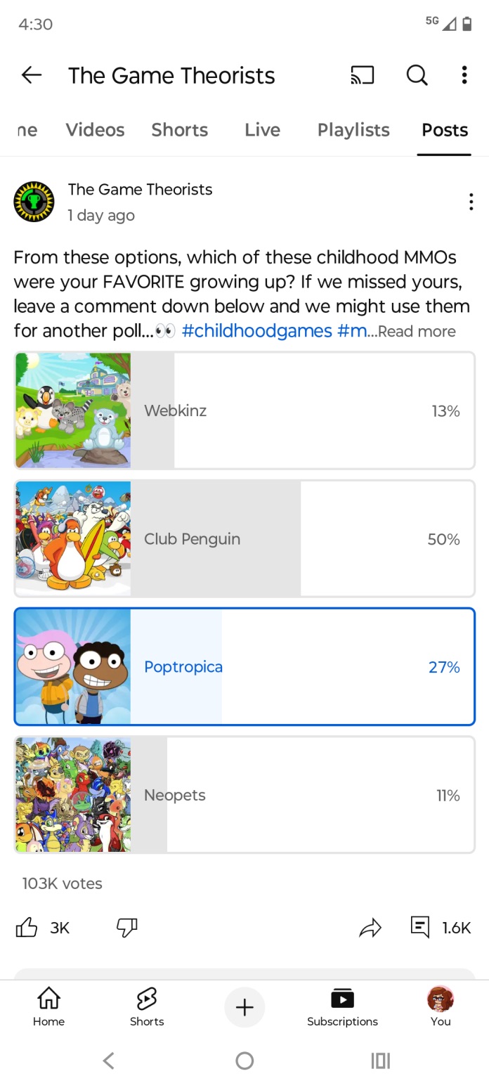 This community poll which gained 100K+ votes asks viewers, “From these options, which of these childhood MMOs were your FAVORITE growing up?” Club Penguin is the obvious winner here on Massively Multiplayer Online games, but our beloved Poptropica firmly stands in second place, beating Webkinz and Neopets. Way to go, Pop!!! ๐Ÿ’™๐ŸŽ‰
