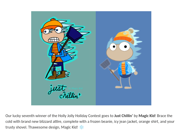 Let’s start from the beginning, shall we? In 2022, the Poptropica creators did a “12 Days of Member Gifts” design contest. I submitted three ideas, and amazingly, one got used for it! I was an art baby back then and also EXTREMELY new to digital art. Somehow, I drew this on just an old Chromebook with the touch-pad thing under the space-bar. 😂