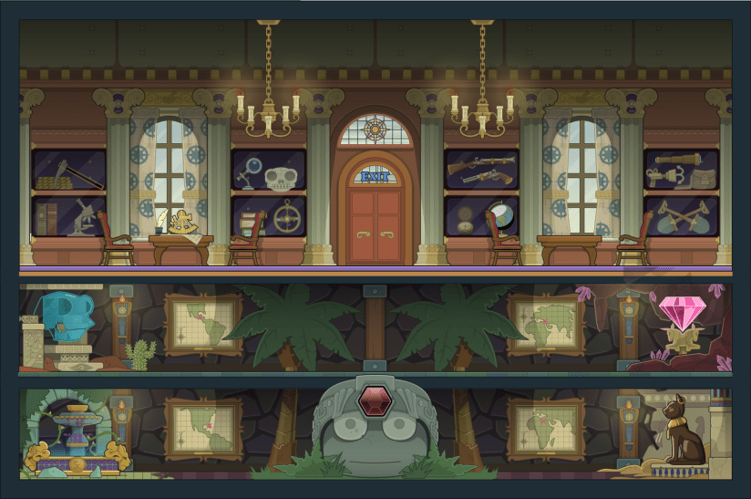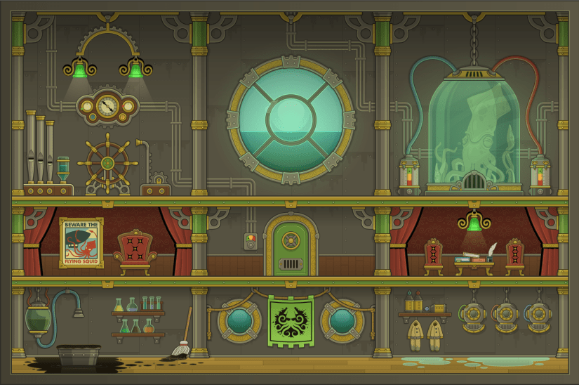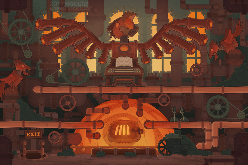 Marking the halfway point, it’s the red-hot boiler room of the Wildfire! This common room screams tribal pride. The symbol of the Wildfire flag, leaping orange flames, decorates a burning furnace connected to branching pipes. I quite enjoy the mechanical steampunk vibe going on in here. The various steam-powered birds, especially the center one with wings spread, are reminiscent of the Mother Phoenix and her chicks from Astro-Knights Island! The hazy orange gradient scheme works well, and the exit, a ladder leading up through the floor rather than doors, is a creative way to match the mood. ๐ฅ