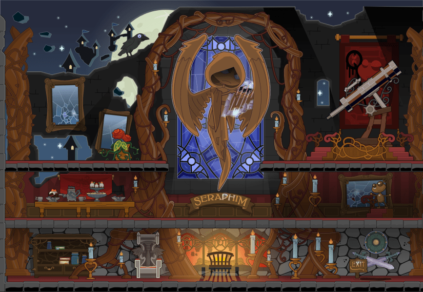 …in 1st place, the angelic abode of the Seraphim! This common room is absolutely breathtaking, and personally, I can’t find anything to dislike about it. The center piece, a hooded Poptropican seraph floating in a stained glass window, is hauntingly beautiful and sets the tone for the rest of the room. The lowest floor’s flickering fireplace gives just enough light so as not to overshadow the stars visible through the crumbling walls in the night sky, and the telescope, candlelight, and distantly floating turrets all beautifully represent the celestial Seraphim name. This common room is well deserving of its number one spot! ๐ชฝ