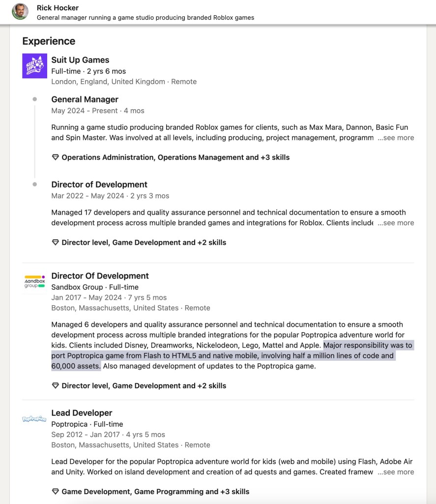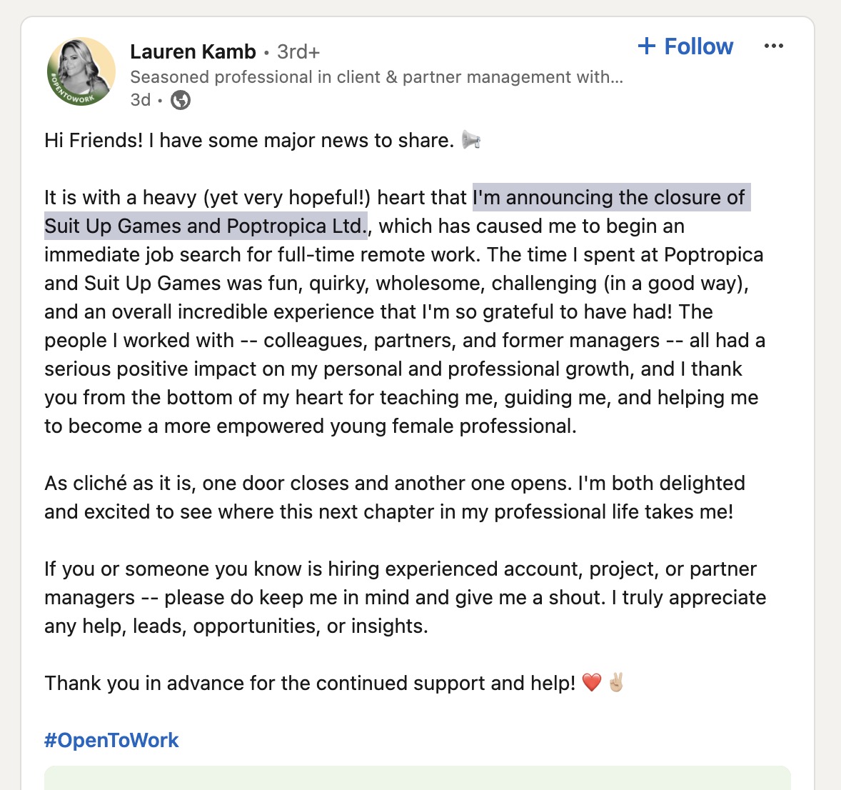 According to her profile, Lauren served as Digital Advertising Account Manager at Poptropica from 2019โ2022, then as Director of Partner Relations at Suit Up Games, Poptropica’s spin-off Roblox studio, from 2022 to now. So it seems safe to say she knows what she’s talking about when it comes to announcing the closure of both companies.