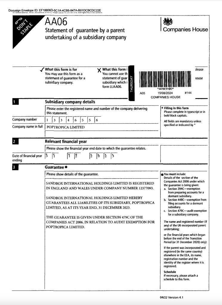 The most recent filing comes just around the time of the latest staff departures, dated 20 August 2024. The document is an “audit exemption statement of guarantee by parent company for period ending 31/12/23”, stating that Poptropica’s parent company Sandbox International Holdings Limited would “guarantee all liabilities of its subsidiary.” In other words, Sandbox is claiming responsibility for all of Poptropica’s financial obligations. But this filing may just be a formality, since Pop was already under Sandbox. (Previously it was under another Sandbox-related parent company, Aspen Newco 1 Ltd.)
