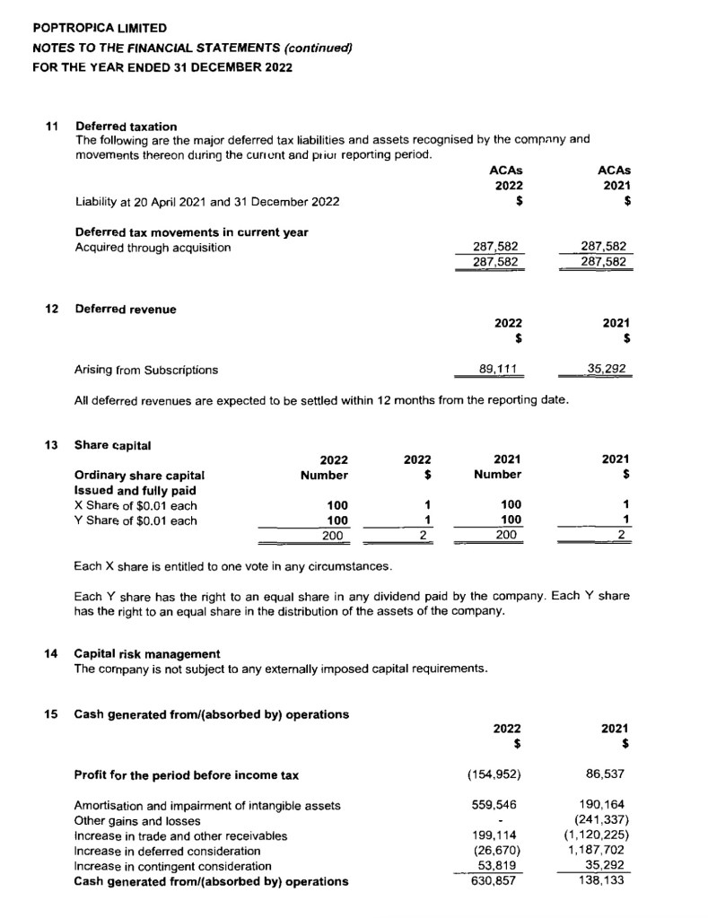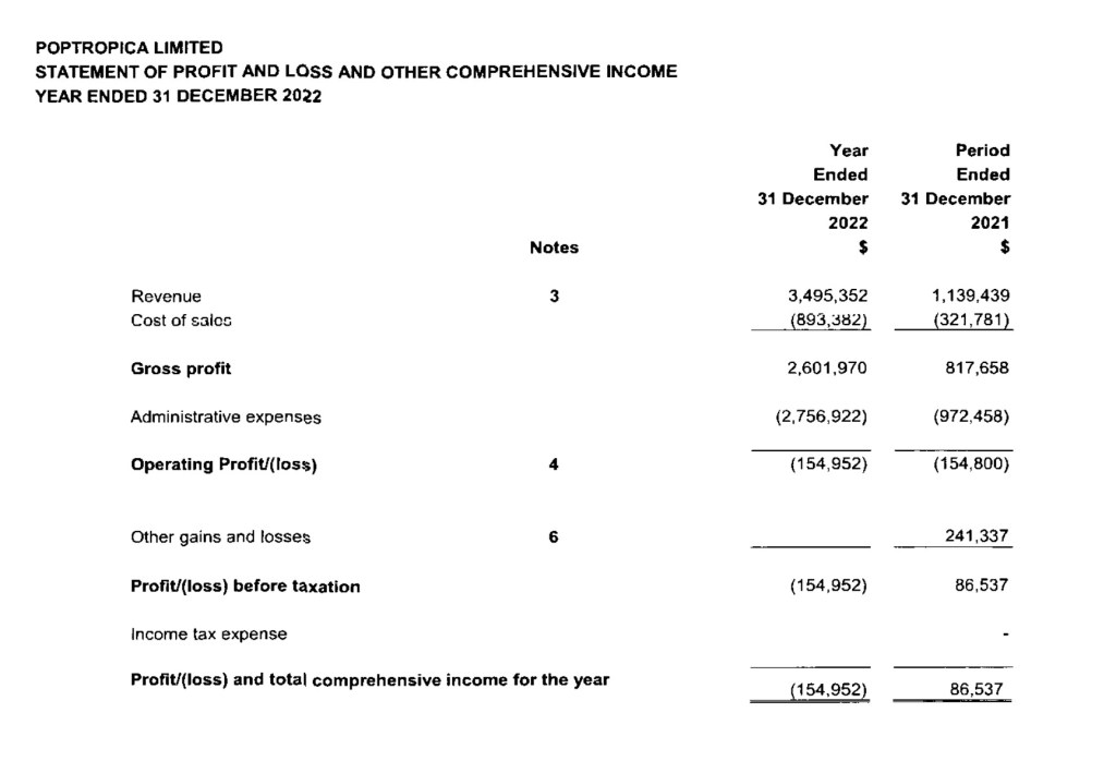 Digging further into the previous audit exemptionโthe “audit exemption subsidiary accounts made up to 31 December 2022″โwe find a more detailed document that includes Poptropica’s older (but latest published) financial statements. While page 2 shows a loss of $154,952 in 2022, the previous year still held a profit with $86,537 in 2021. But by page 12 we can see that the cash generated from operations in 2022 was $630,857, so perhaps things were still doing alright then.