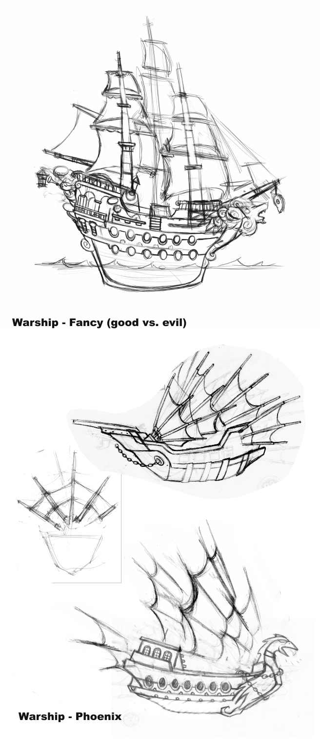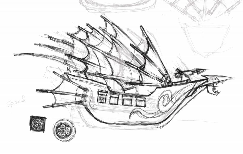Time goes by so quickly on Poptropica. Hard to believe that it’s been a year since we started working on Skullduggery Island. Here’s an early sketch of the Phoenix Warbird, dated from April 2010.Somehow, that ended up being the ship that sank… me! Incredible.