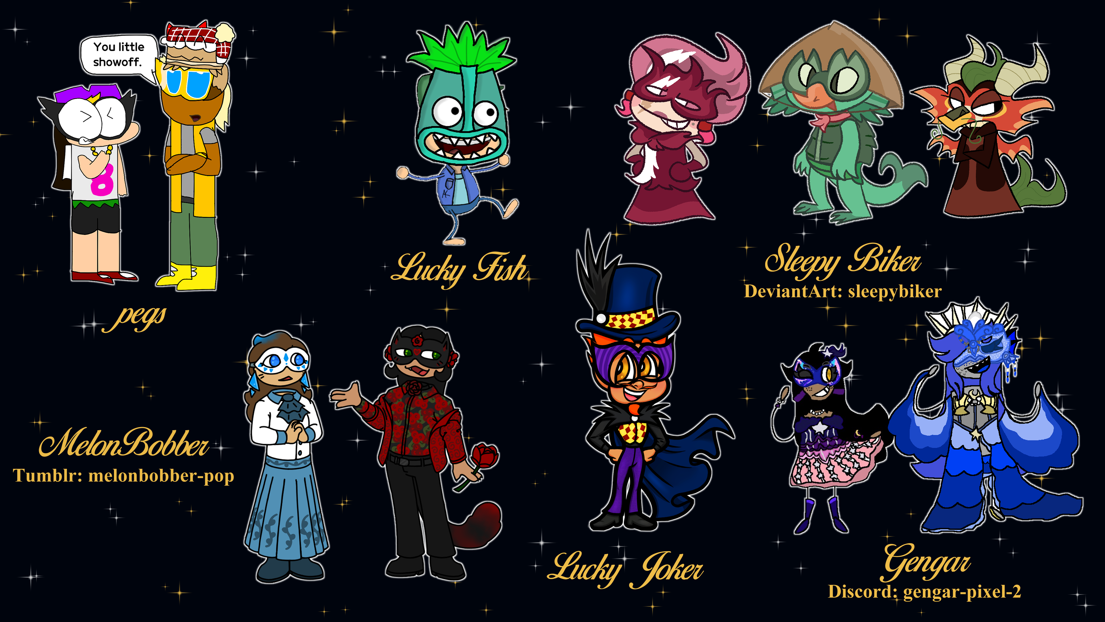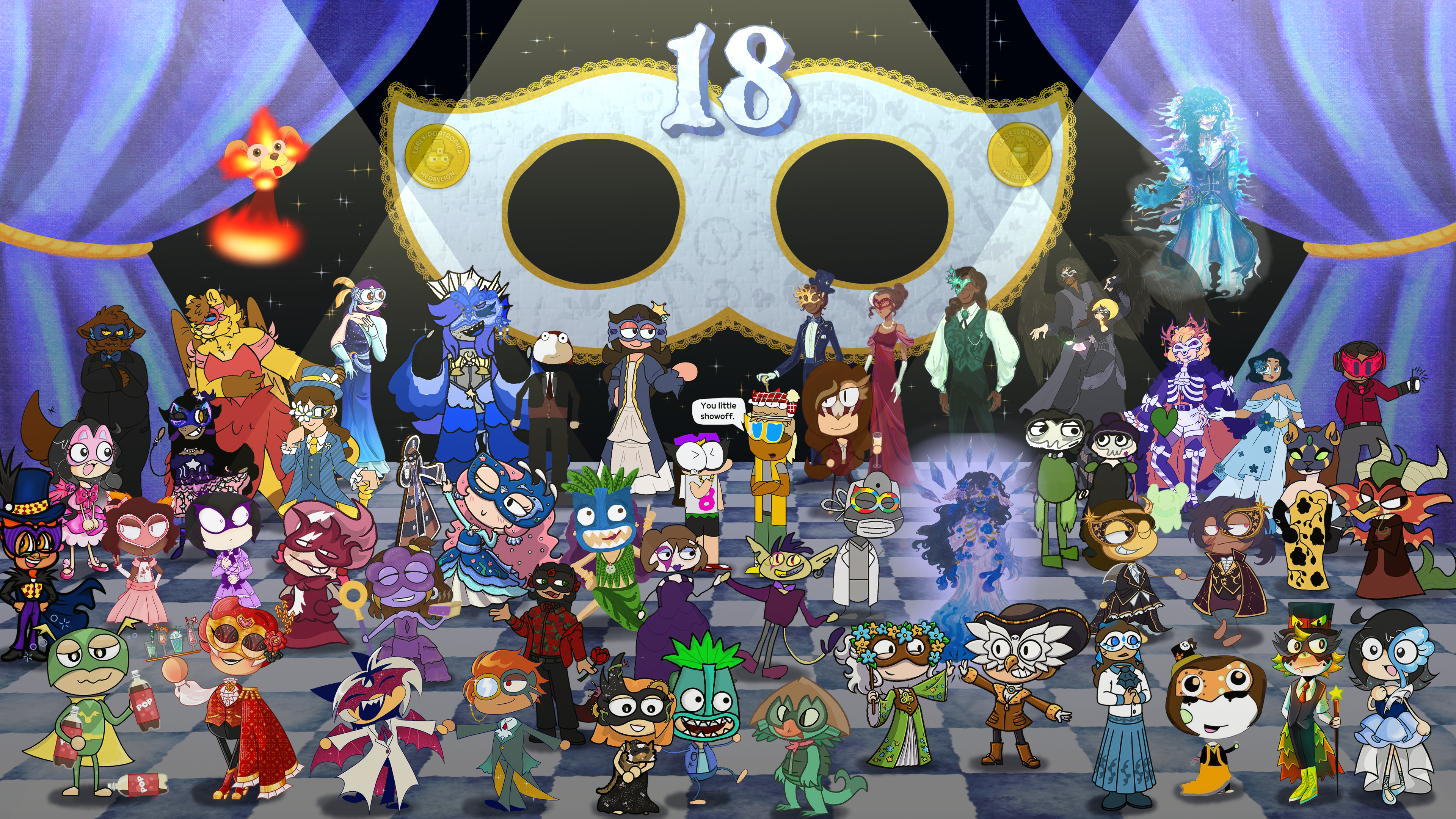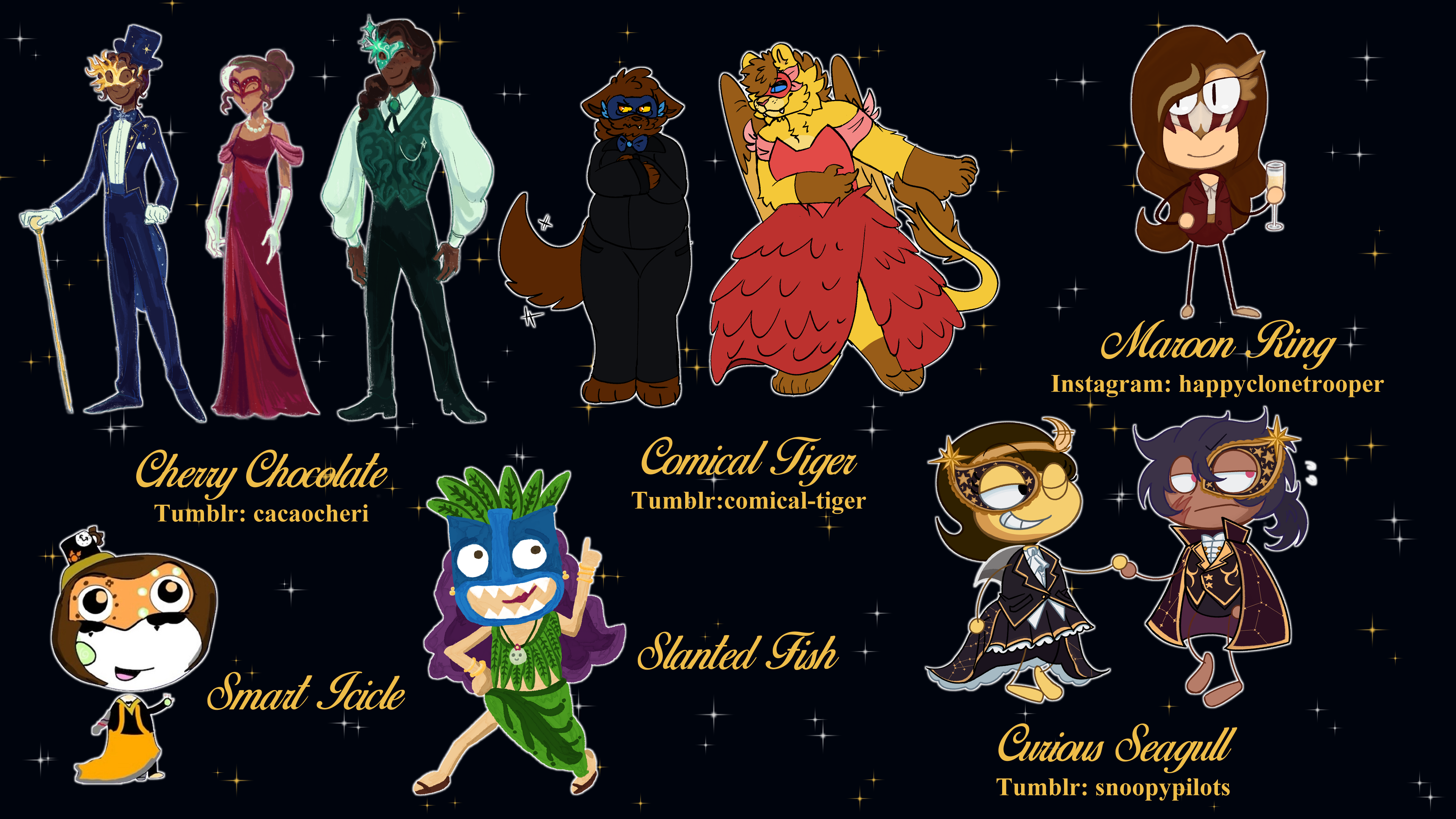 A round of applause to all 32 artists who contributed to this year’s birthday collage! These internet illustrators accepted our invitation and filled the Poptropica Help Ballroom with 54 masked characters. Let us admire the attendees’ fashion and pay tribute to their talented designers. ๐จโ๐จ๐๐งฅ