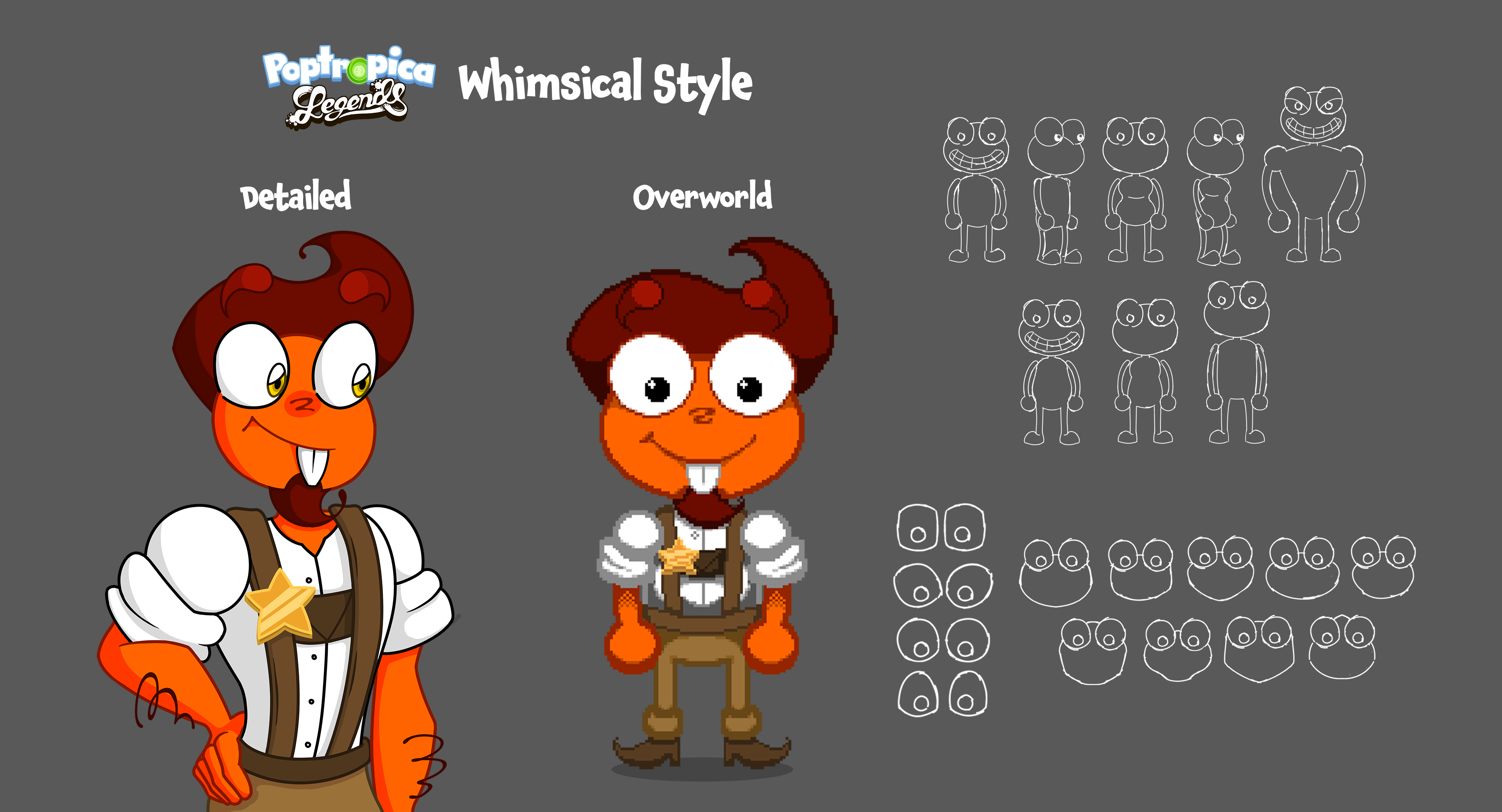 I like to think of the Legends style as if Poptropicans were designed by Walt Disney โ and Iโm naming it Whimsical Style. Itโs clear that there is a delicate balance when it comes to depicting Poptropicans in-game, as we can see how that might be poorly executed with Poptropica Worlds. Because of this, overworld Legends characters (weโll call this Overworld Whimsical Style) are close but not too similar to their more fleshed-out depictions (weโll call this Detailed Whimsical Style).