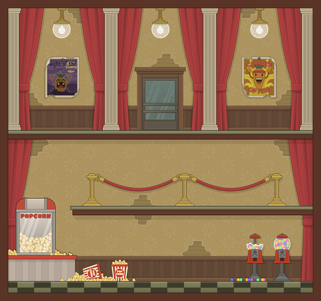 • Common room: Cinema โ€“ showing Night of the Living Carrots and Carrots of Fire, which parodies the names of the films Night of the Living Dead and Chariots of Fire.
