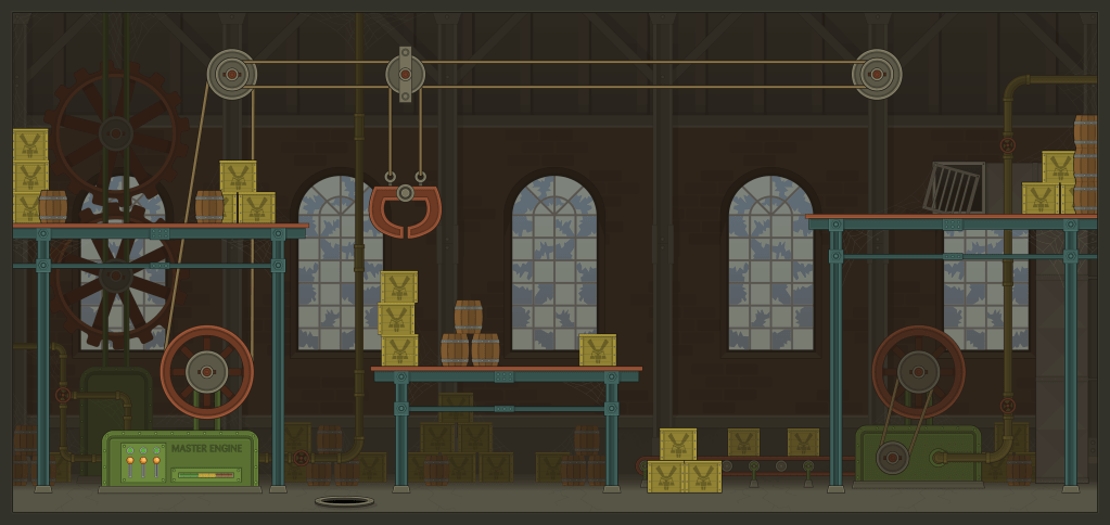 In this next room, pull the green master engine’s middle lever down all the way, and pull the other levers only halfway. Then climb up to the platform with a pyramid of barrels and a stack of boxes. Jump onto the stack of boxes, then wait until the claw comes around.