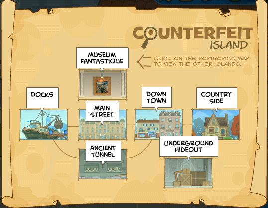 • Counterfeit Island is Poptropicaโ€™s 10th island. An Early Access pass was made available for 500 credits in the Store on December 21, 2009, and anyone who completed the island within the early access period won 200 credits for free. It was released on January 4, 2010ย for all.