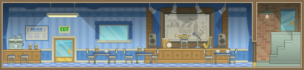 Next, show the screen print to one of the mimes.ย The mime will signal to you,ย instructing you to enter the Jazz Cafe.