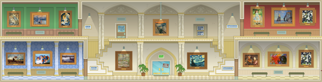 Go to the bottom right wing of the building (expressionism) and click the third painting. You should now be carrying the painting. Go to the bottom left wing (realism) and click the middle painting.
