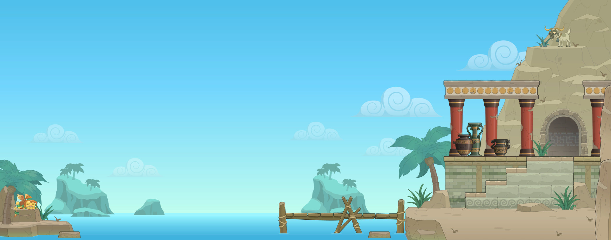 • On the island of Crete, if you go left past the ship and click on the palm tree, it will reveal a sleeping Sphinx. (This mythical creature played a role in the original Mythology Island.)