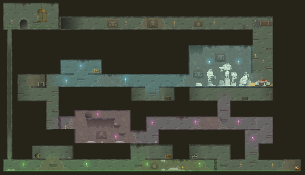 Go back down and go left until you see a skeleton. Jump up on the platforms in front of him and push the boulder down to crush him. (RIP) Now you’ll be able to get the Skeleton Key.