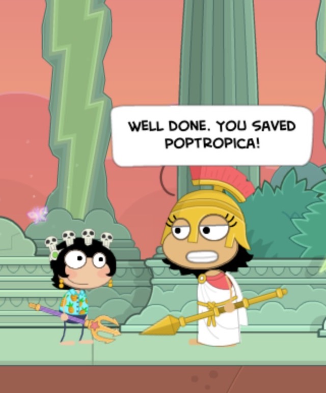 After you defeat the vicious thunder god, he’ll retreat, and Athena will appear. She’ll commend your bravery and congratulate you by bestowing the Island Medallion upon you, along with 200 credits to spend in the Poptropica stores! Congratulations, you’ve completed Mythology Island!
