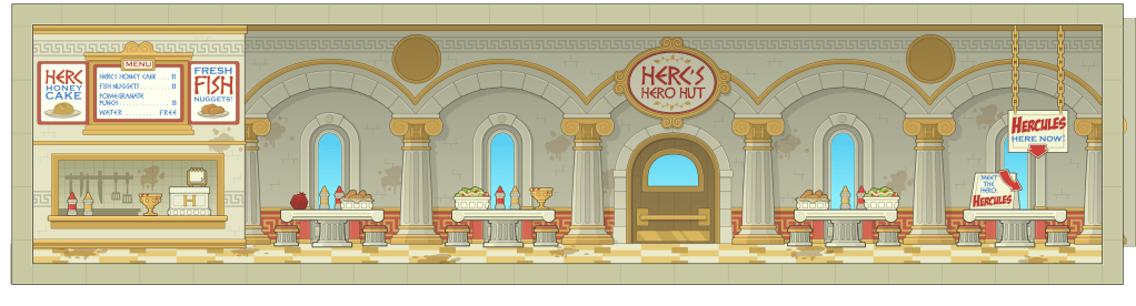 You’ll find Hercules finally back from his lunch break outside of Herc’s Hero Hut just right of the area where Zeus showed up. Ask for his help, and he’ll hesitate, but you insist it won’t be long thanks to your touchscreen mirror.
