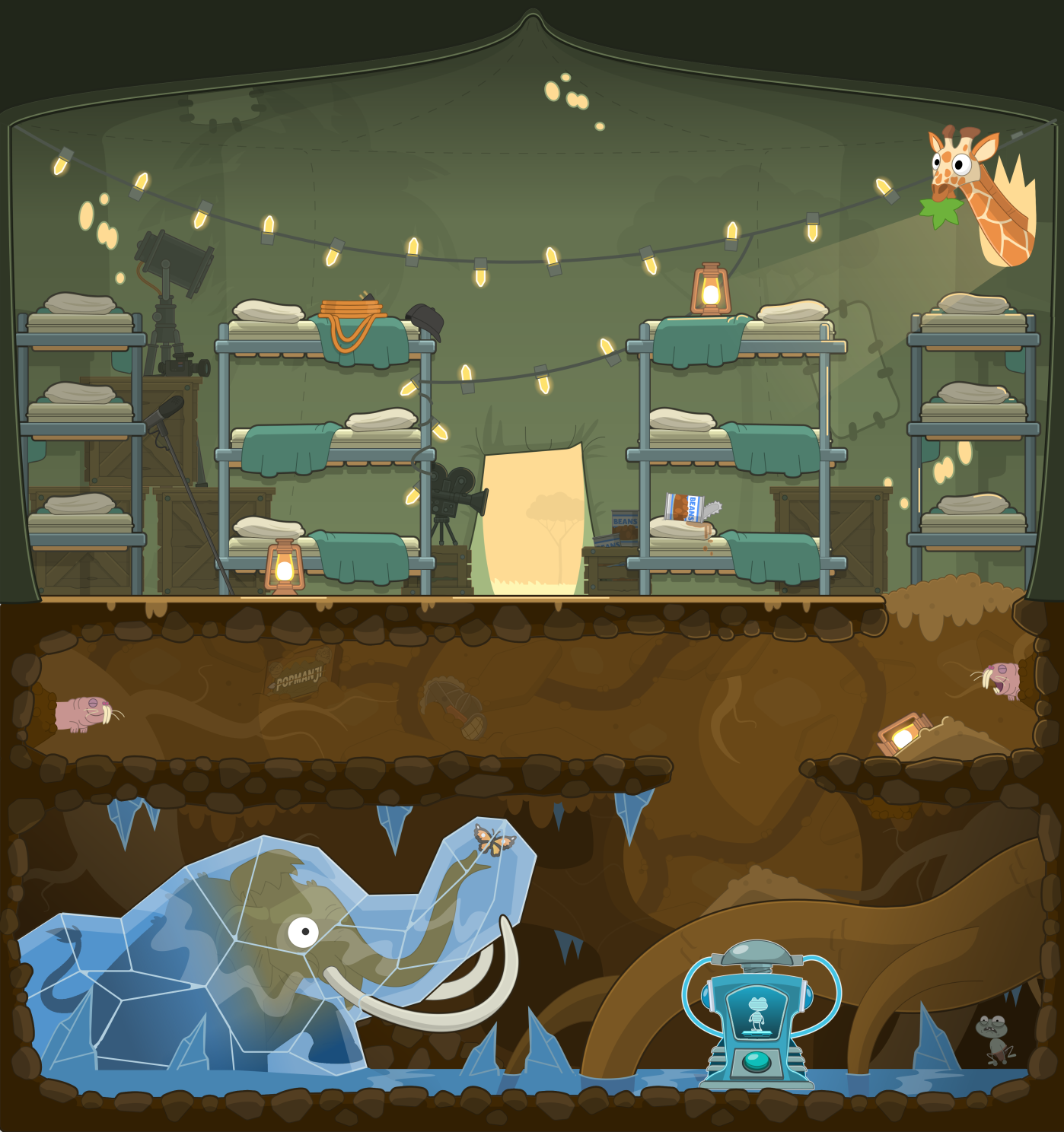 - You can also shock the camera-woman next to the base camp by clicking on her. Unlike the zebra, she doesn’t return.