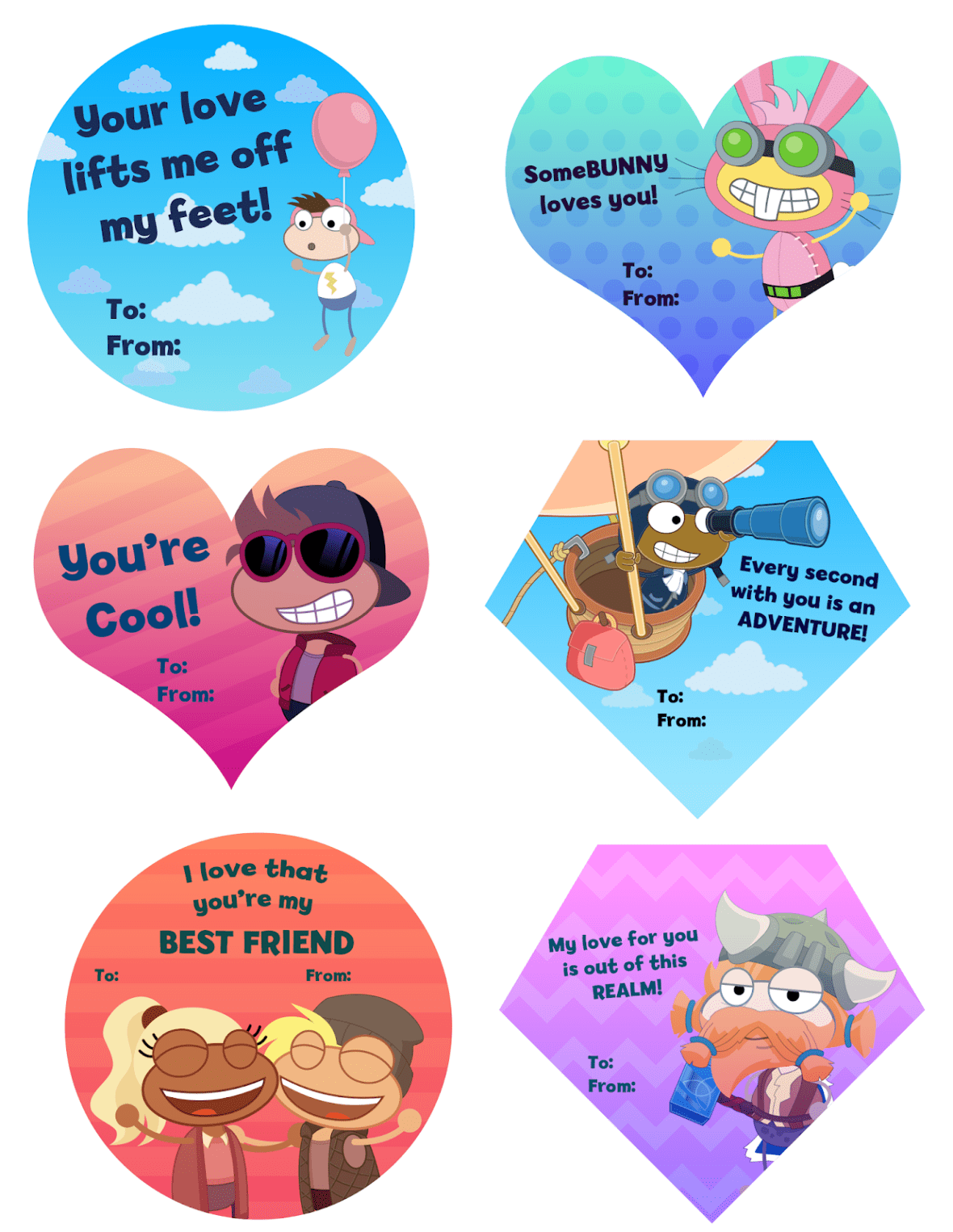 You can celebrate by printing out these 6 adorable Poptropica valentines. To print, right-click below to save the image to your computer, and then go to print the file.