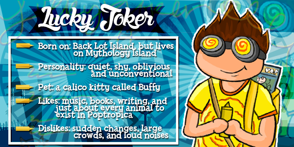 Lucky Joker was born on Back Lot Island and lived on the overlooking hills of the island for most of his life. He’s an only child and often did things on his own since he didn’t have many friends to play with. He found various ways to entertain himself like coloring and solving puzzles, but what he likes to do most (and still does today) was learning.