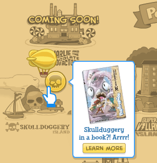 There’s some new additions to the Poptropica map! Charlie and the Chocolate Factory Island is now listed as coming soon, and Skullduggery Island was pushed to the front page to advertise its upcoming book.