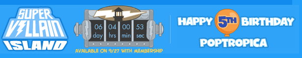 That is, if you’re a Poptropica member! Super Villain Island is set to release on September 27, 2012, which is next Thursday! We don’t know yet when it will be released to everyone, but maybe non-members will get a little demo. We’ll see. 😛