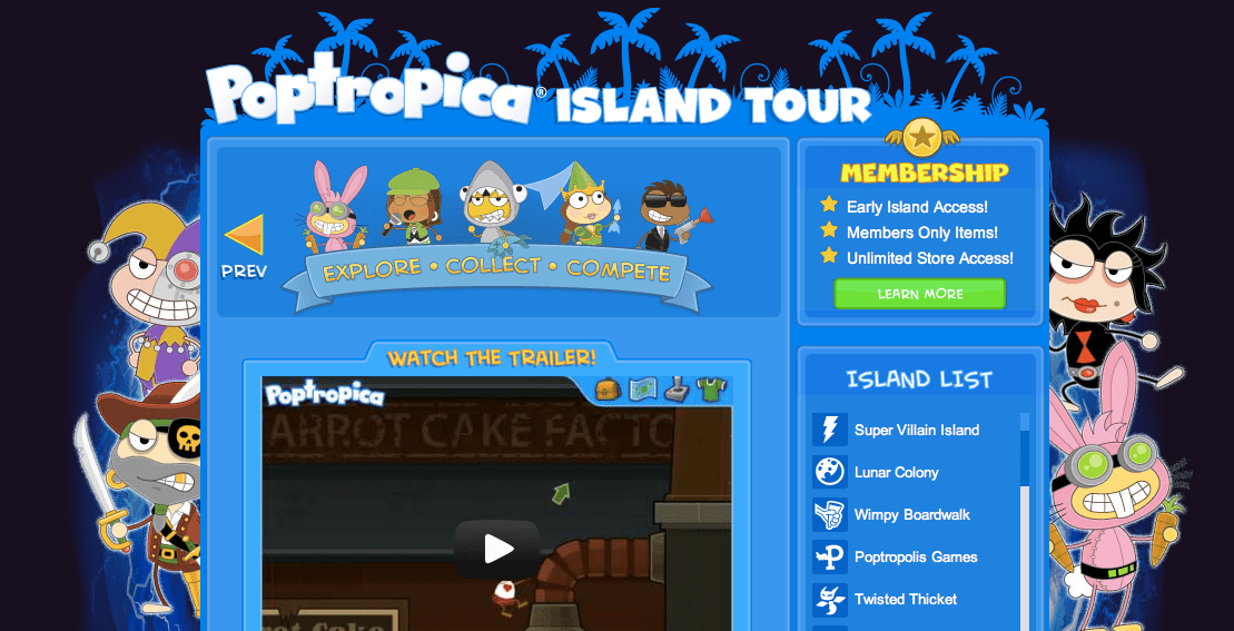 The Poptropica Tour pages for all islands have been redecorated for the upcoming Super Villain Island, with dark edges and the main villains (Bard, Crawfish, Widow, and Hare) circled with blue lightning.