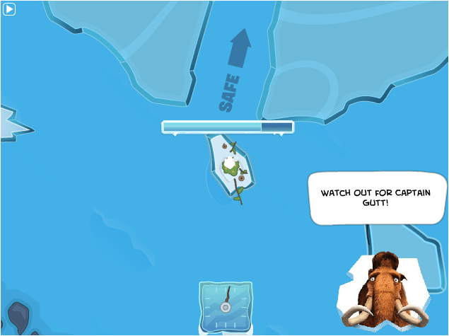 The game that you can play is called Escape from Captain Gutt.  This game is really easy.  What you do is you sail your iceberg, following the arrow of a compass.  The arrow points to your home.  The iceberg’s controls are exactly the same as the ones for your boats in Skullduggery Island, which makes it that much easier.  Basically just point your cursor in the direction that you want to go and click to fire what they say are cannonballs, but I have a sneaking suspicion that they’re actually snowballs.  Just try to avoid hitting other icebergs, running into sea crabs, and getting fired at by pirate ships.  Oh, and, obviously, Manny doesn’t understand that someone shouting things at you while you’re trying to sail is very distracting.  So, just try to ignore him.