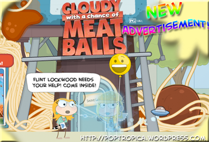 Well, first you have to enter the advertisement (obviously xD), then talk to the guy with the crazy brown hair (who is probably Flint). He says his machine that makes food fall from the sky is broken. OH NOEZ! NO MOAR FOOD FALLING DOWN FROM THE SKY?!?! THIS IS A DISASTER! D: