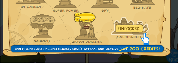 We’re offering 200 FREE CREDITS to Poptropicans that complete Counterfeit Island during the Early Access period.