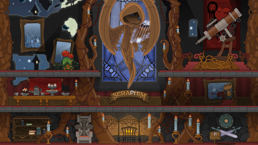 …in 1st place, the angelic abode of the Seraphim! This common room is absolutely breathtaking, and personally, I can’t find anything to dislike about it. The center piece, a hooded Poptropican seraph floating in a stained glass window, is hauntingly beautiful and sets the tone for the rest of the room. The lowest floor’s flickering fireplace gives just enough light so as not to overshadow the stars visible through the crumbling walls in the night sky, and the telescope, candlelight, and distantly floating turrets all beautifully represent the celestial Seraphim name. This common room is well deserving of its number one spot! ๐ชฝ